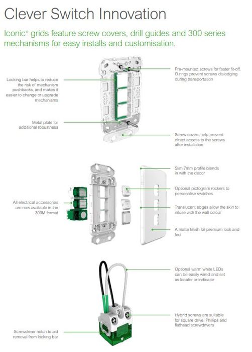 Iconic® is based around a unique grid design, with a choice of three different ranges of skins that simply clip on. Once the grids have been installed by an electrician, it’s easy for anyone to change the skins at any time. You simply clip off the existing skin and clip on the new design.