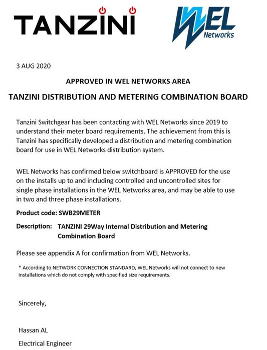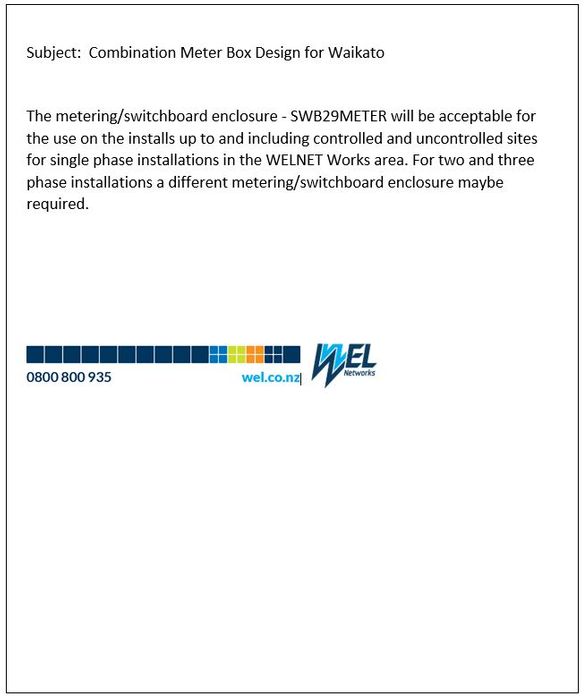 WEL Networks has confirmed below switchboard is APPROVED for the use on the installs up to and including controlled and uncontrolled sites for single phase installations in the WEL Networks area, and may be able to use in two and three phase installations.