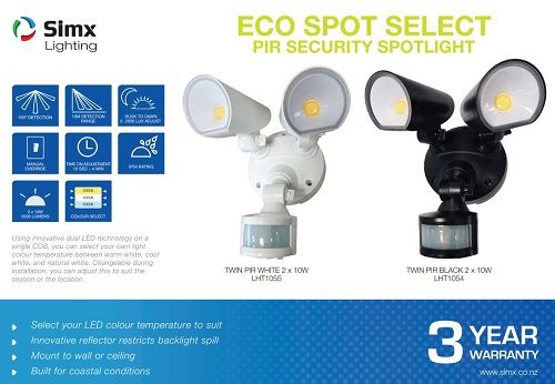 The Simx Eco Spot Select incorporates a PIR motion sensing device which continuously scans a preset operating zone and immediately switches the light on when it detects movement in that area.