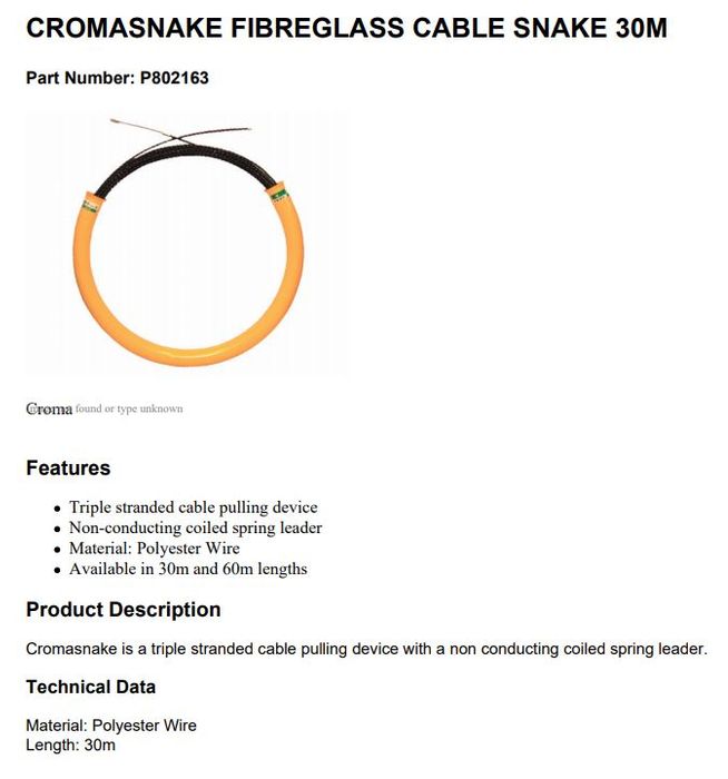 The Cromasnake is a robust and efficient cable pulling device designed for professional use. It features a triple stranded cable with a non-conducting coiled spring leader, making it ideal for use in environments where electrical conductivity is a concern.