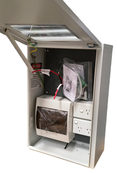 Temporary Builder BoxGet power on the worksite, fast. The Temporary Builder Box is a robust and reliable power solution that saves you time and ensures safety.Fully designed, engineered, tested, and approved in New Zealand, this box is built to handle our unique conditions. It comes pre-built and pre-wired for instant installation, so you can start working right away.Constructed from rugged, powder-coated galvanized steel, it features both 10A and 15A RCD-protected sockets for comprehensive safety. With a lockable latch and a lid arm to hold the cover open during use, this box is the ultimate secure and convenient power source for any temporary site.
