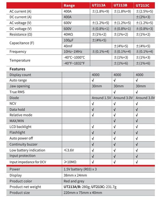 UT213 series is 400A digital clamp meter with CAT III 600V safety standards. These meters are designed for electricians and HVAC/R technicians. The built-in flashlight also makes these meters useful tools when working in dark environments.