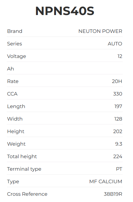 NEUTON POWER 12V MF CALCIUM (197 x 128 x 202) CCA-330