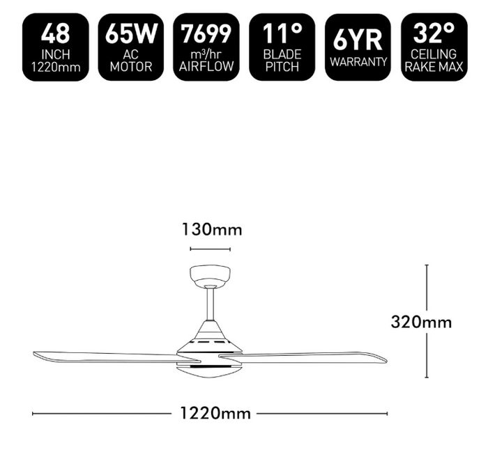 A contemporary designed ceiling fan with four plywood blades combined with a powerful 65W motor. Now with even better features, including LED light adaptable, easier blade installation and polyfoam-free packaging.