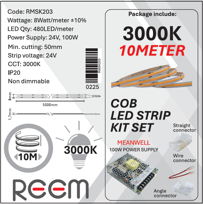 - 3000K LED Strip10Meter cuttable IP20 Meanwell driver