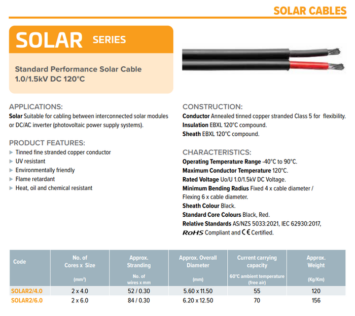 Standard Performance Solar Cable 1.0/1.5kV DC 120degree