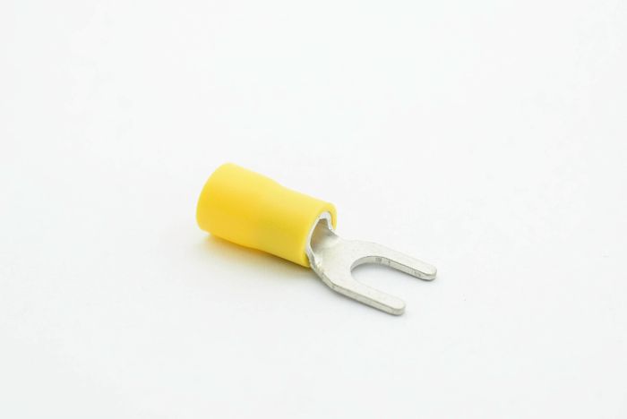 PVC fork terminal with easy entry holding a maximum cable size of 6mm and 5mm stud size.