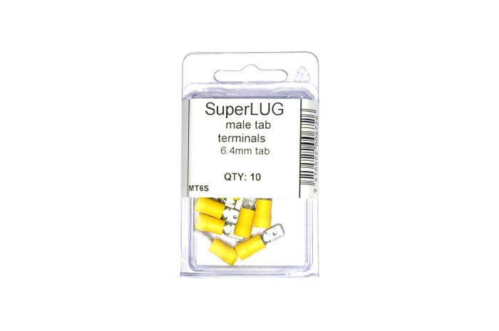 PVC male tab with easy entry , holding a maximum cable size of 6mm and a hole blade size of 6.4mm.