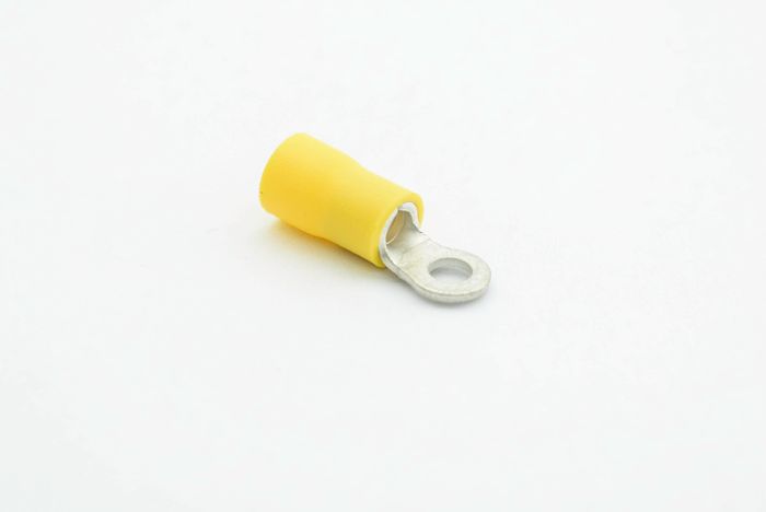 PVC ring terminal with easy entry holding a maximum cable size of 6mm and stud size of 3mm.