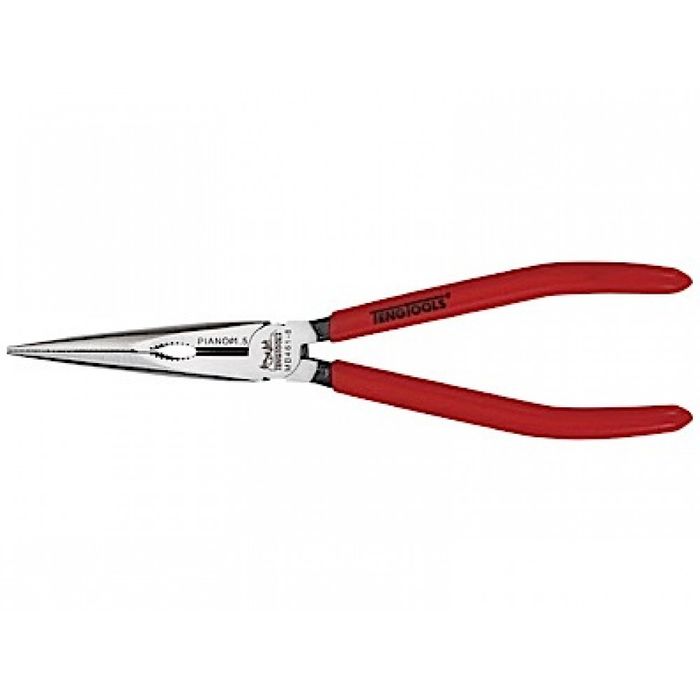 Long nose pliers. Features a serrated grip surface, 80° cutting edge, titanium coated joints and long, straight jaws. DIN 5745.