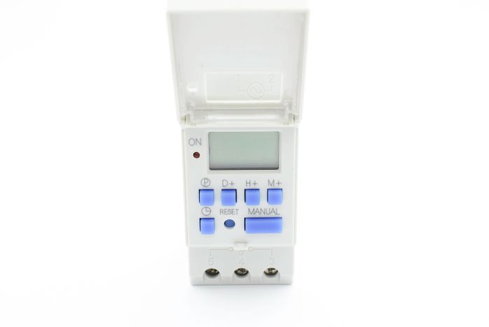 Weekly programmable digital timer with dinrail installation and advanced one week prior pre-setting.