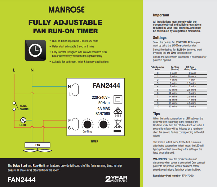 Adjustable run on time and start delay feature to give full control of the running time and to make sure that the room is clear of air.